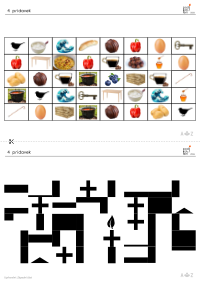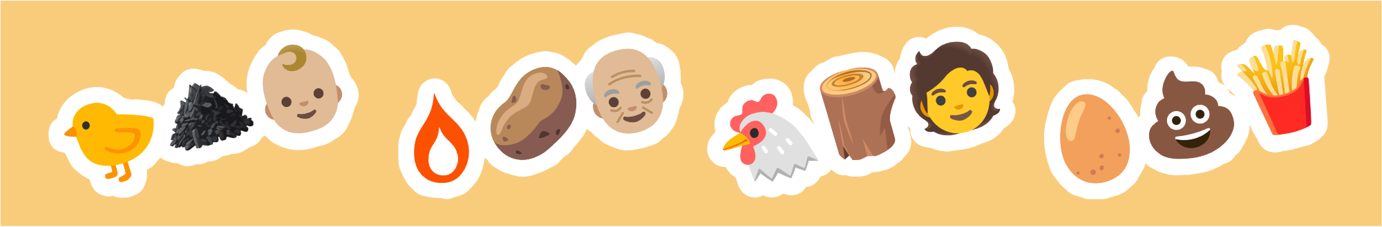 Na obrázcích jsou trojice stádií 4 procesů: dřevo->oheň->popel, dítě->dospělý->senior, vejce->kuře->slepice, brambora->hranolky->hovno. Obrázky označíme podle stádia v procesu (1->2->3) a použijeme ternární abecedu z Pomůcky. Dostaneme PLUH