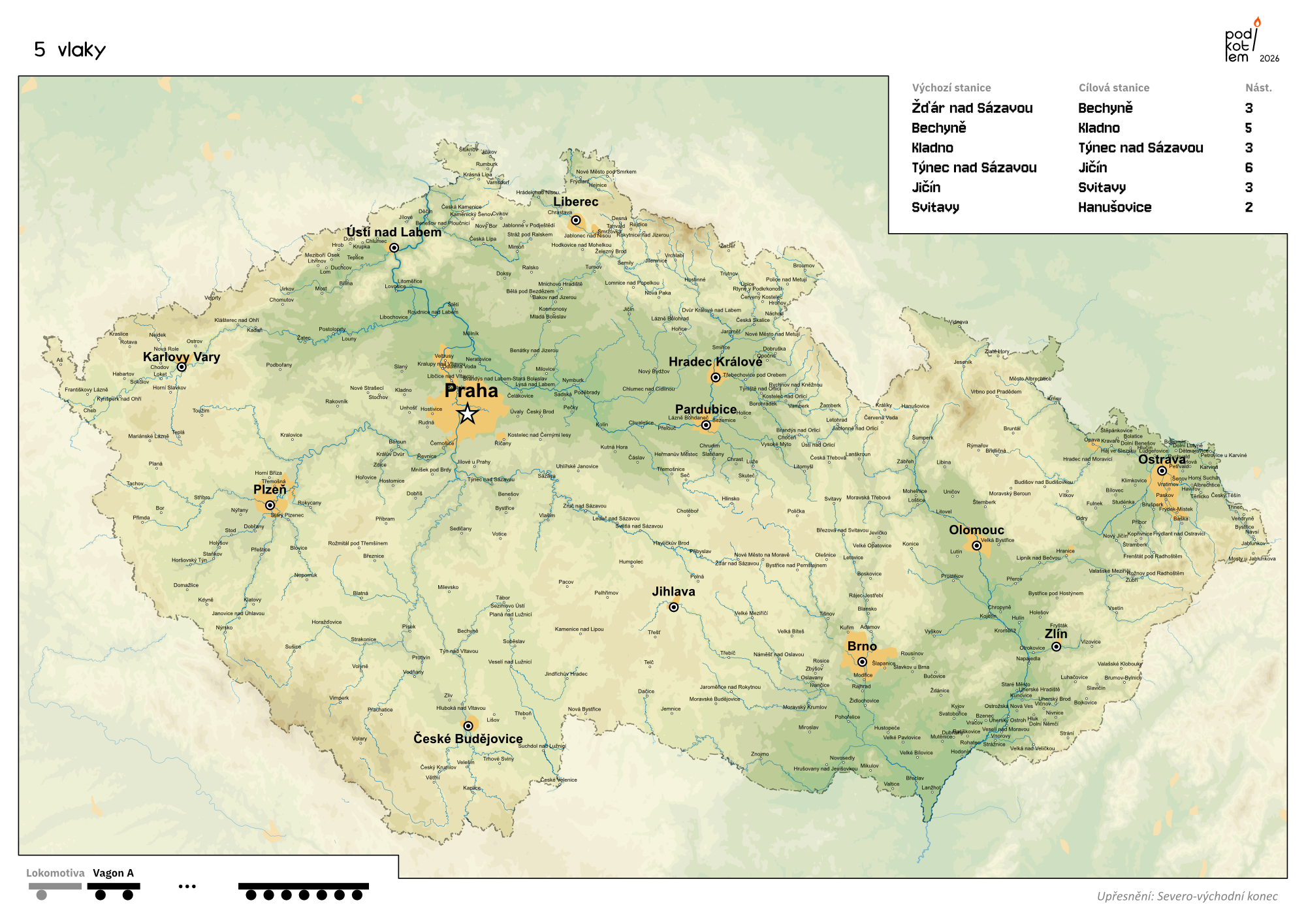 Zápalek je 24, stejně, jako písmen letošní abecedy. Na každý úsek vyjede vagón s číslem odpovídajícím nástupišti a délky odpovídající vzdálenosti mezi městy. Tím dostaneme na každý úsek jasně danou zápalku, která kóduje jedno písmeno. Tajenku přečteme po cestě, jako "VRBOVA".