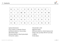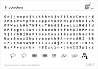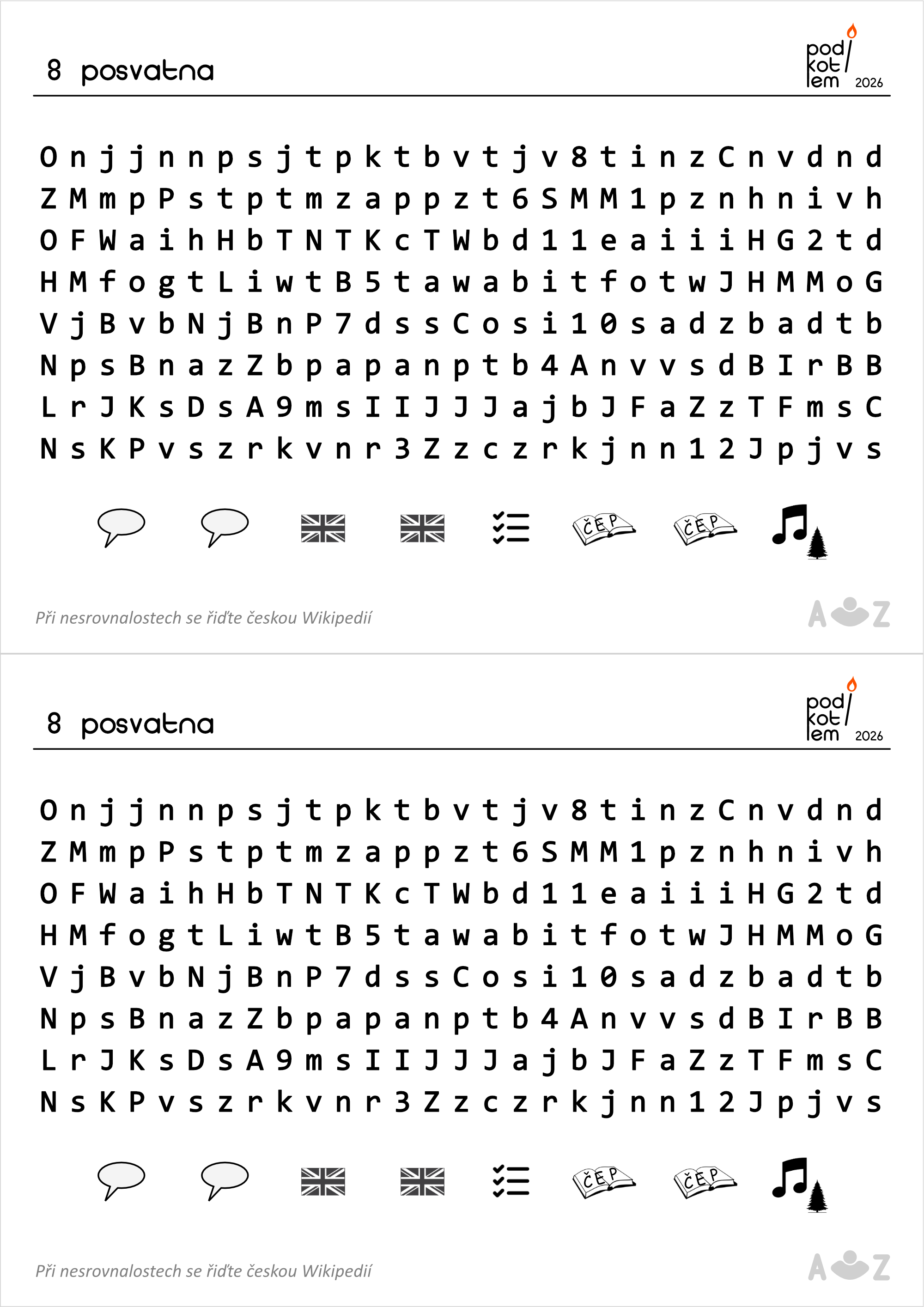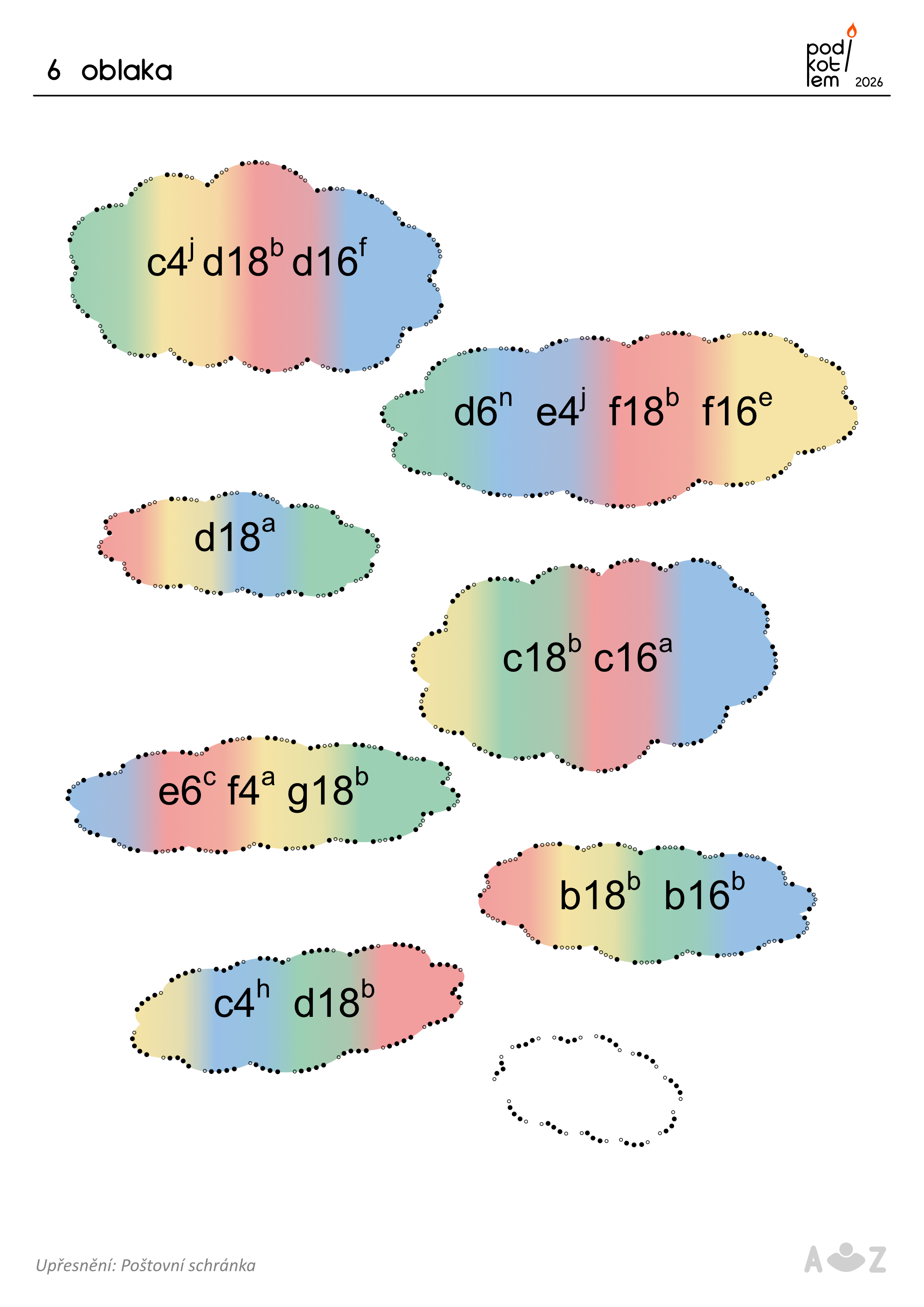Podle definice vyhledáme slova v poli písmen, přičemž vidíme, že slova leckdy různě zahýbají. Vyhledaná slova můžeme ""obarvit"" podle ustálených slovních spojeních s barvami (žlutá zimnice, modré z nebe, zelený čaj, …). Poté čteme pořadí barev v každém řádku, načež dostaneme slovo ""OMEGA"", což je plastika poblíž knihovny M. J. Sychry.
