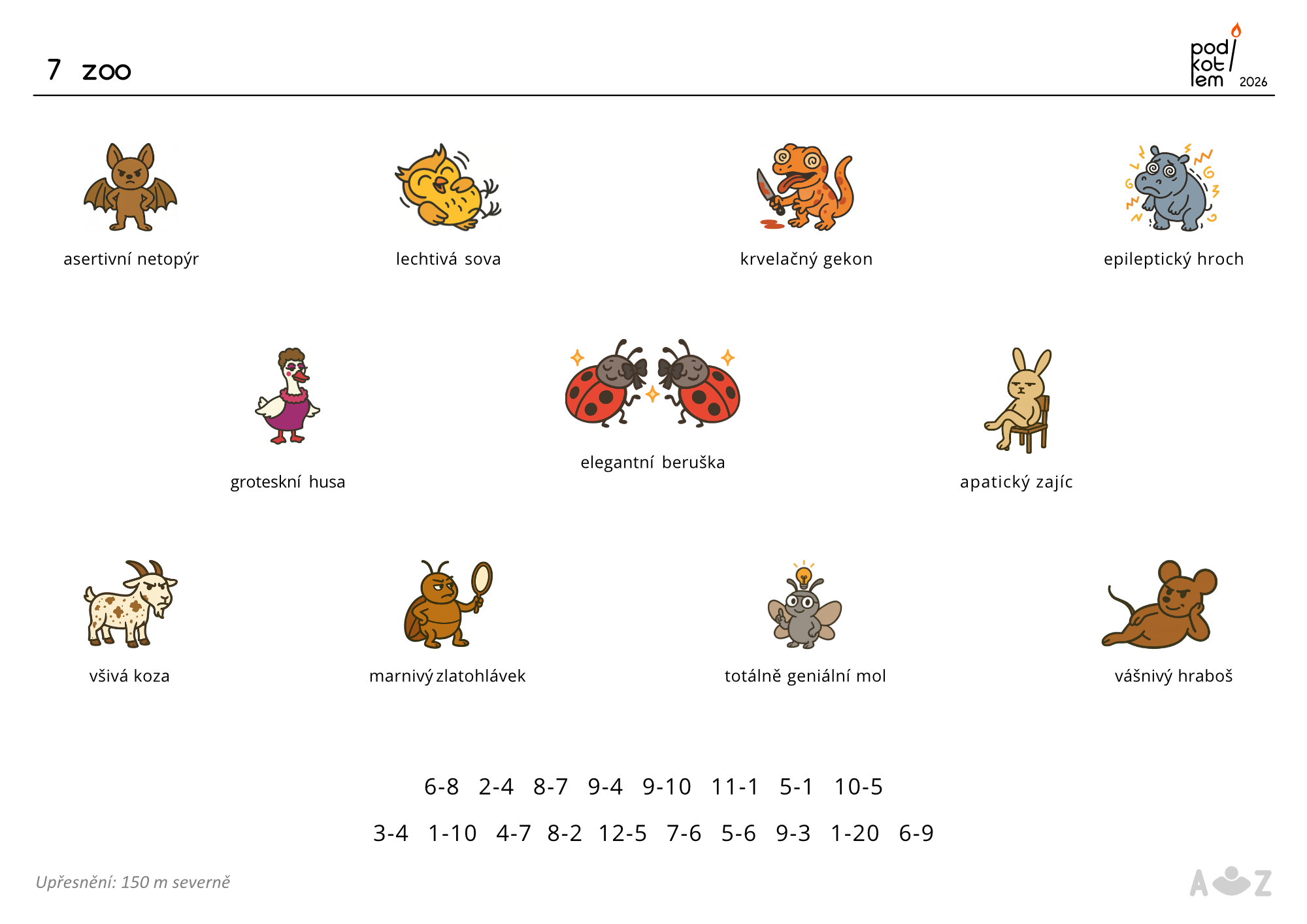 Iniciály názvů zvířat odpovídají iniciálům všech bývalých československých a českých prezidentů. Prvním krokem k řešení je seřazení prezidentů podle funkčních období (od Masaryka k Zemanovi). Klíčem k řešení šifry jsou pak dvojice čísel - první číslo značí prezidenta podle pořadí, druhé číslo potom písmeno v jeho jméně. Řešením šifry je ZASTÁVKA LIBUŠÍNSKÁ