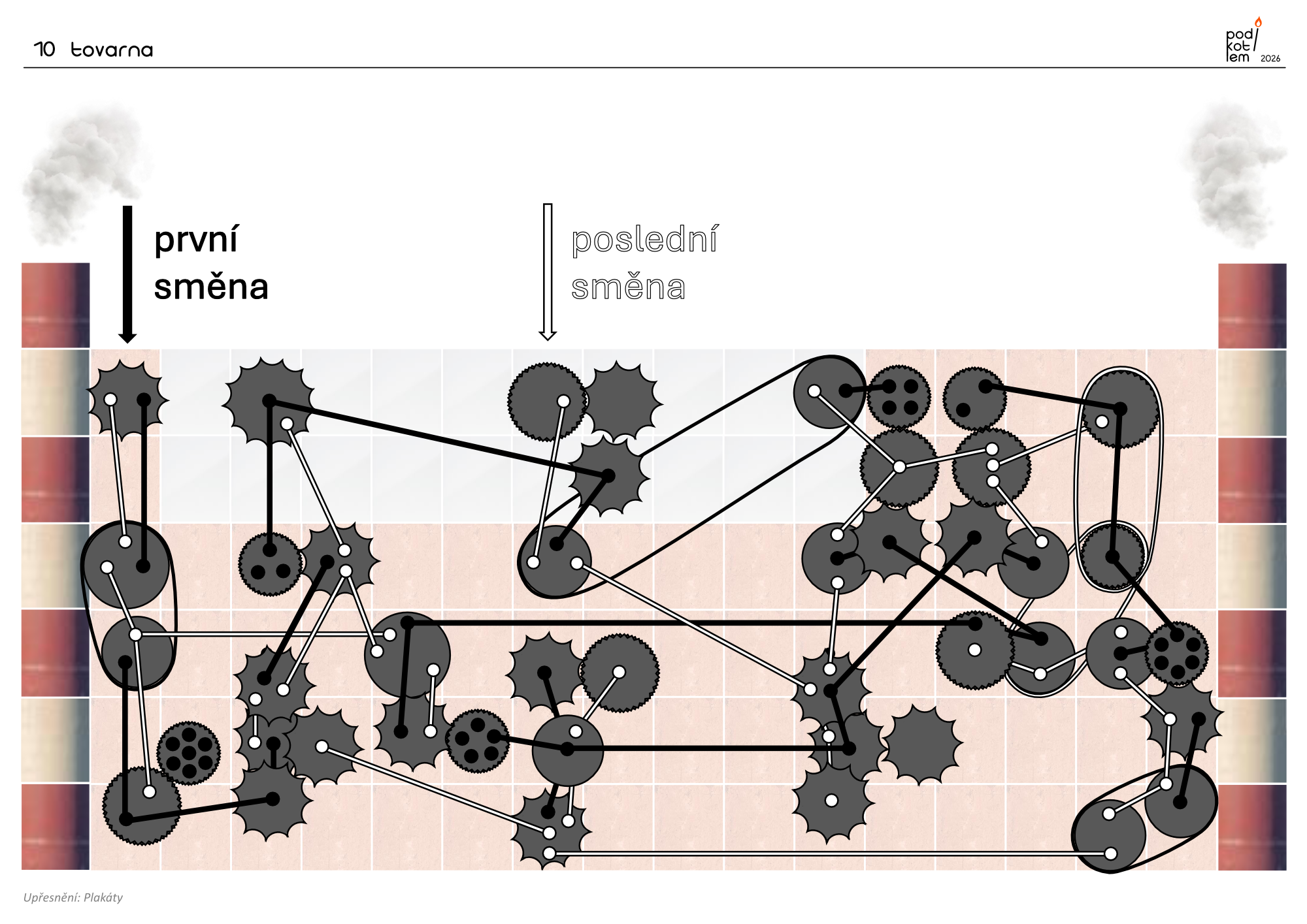 Kolečka v továrně se nacházejí v šesti tvarech (tři druhy zubů a dvě velikosti), díky čemuž se dají svou podobností okraje a odpovídající velikosti přiřadit k českým mincím (1; 2; 5; 10; 20; 50 Kč). Pokud čteme podle "první směny" Braillovým písmem kolečka ve směru černé šipky, dostaneme mezitajenku ve tvaru: "KORUNYCHPRVKY". Mezitajenka nás navede směrem, kdy kolečka odpovídající jednokorunám přiřadíme podle tvaru továrny k jednotlivým chemickým prvkům. Ty seřadíme podle počtu teček v jednokorunových mincích a zkratky názvů prvků přečteme, načež dostaneme druhou fonetickou mezitajenku "SECTIBREILA". Pokud sečteme sumu mincí v každém ze segmentů Braillova písma dostaneme číslo, které s ohledem na dřívější vodítka přiřadíme k protonovému číslu chemických prvků. Pokud je následně přečteme podle směru bílé šipky ("poslední směny") dostaneme finální tajenku "KOVARNAPARKOVISTE". Další zastávkou je tedy restaurace Kovárna, další šifra se poté nachází v blízkosti menšího parkoviště před restaurací.