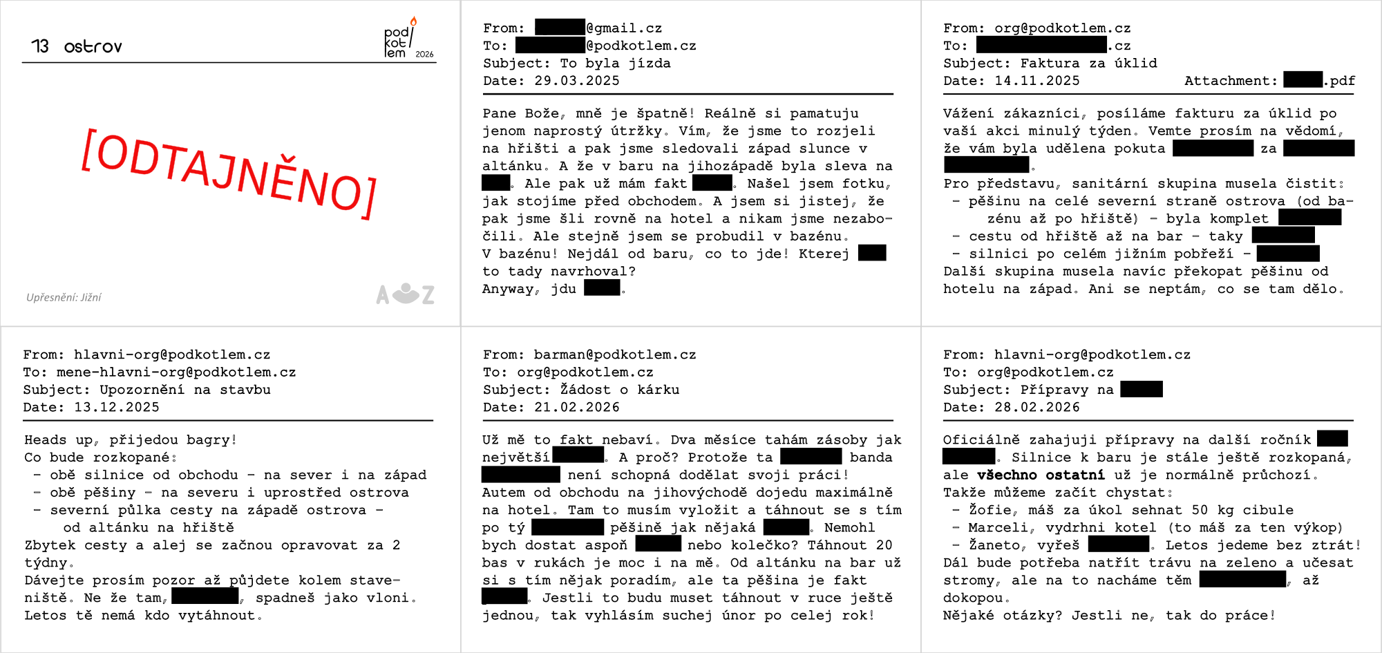 Vytvoříme si mapu ostrova. Na ostrově se nachází 6 míst, propojených komunikacemi ve tvaru sedmisegmentové šifry. Každý email odpovídá jednomu písmenu. Pokud zaznačíme, o kteých komunikacích se každý email zmiňuje, dostaneme VESNA.